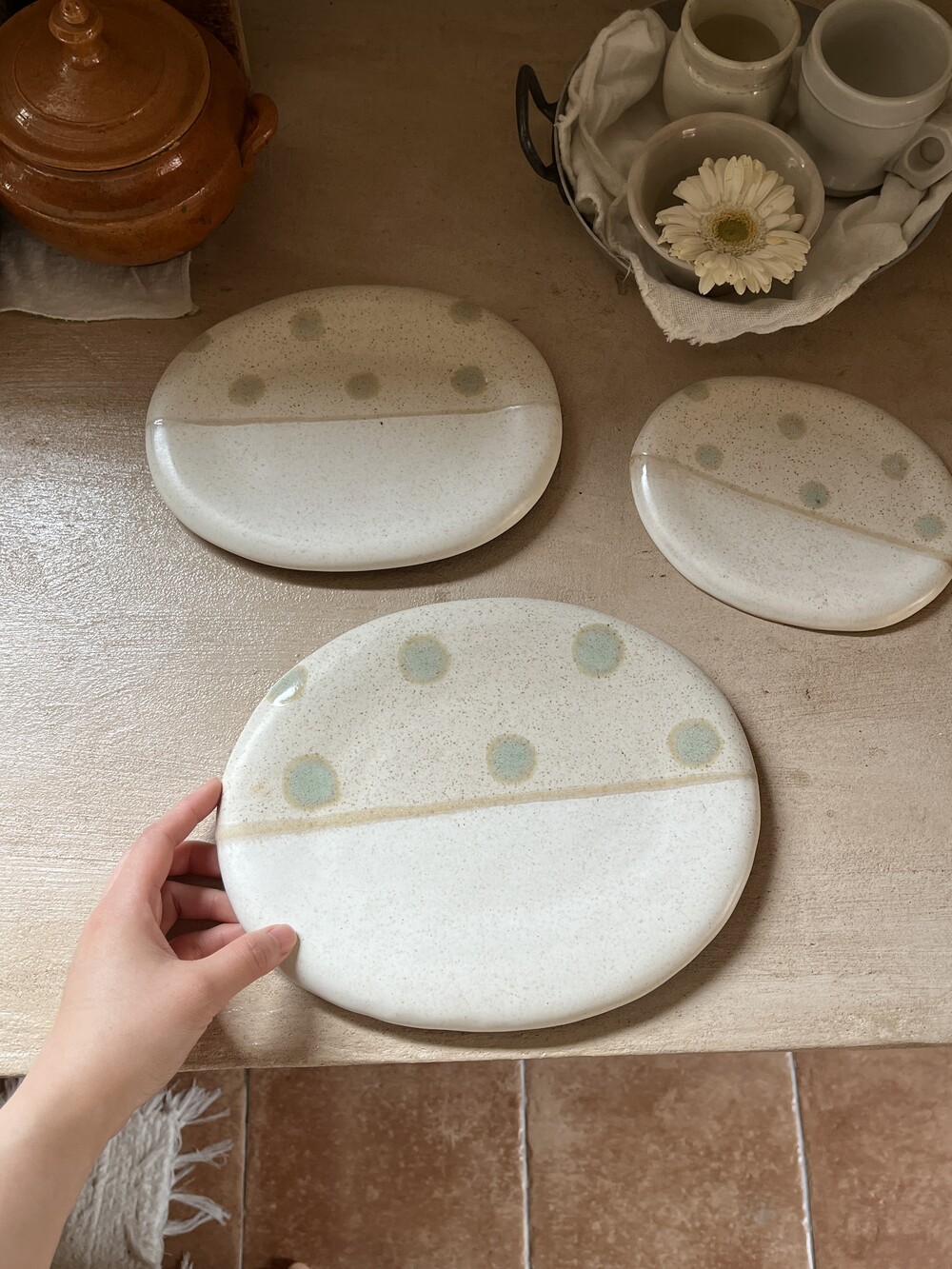 - 모든 제품은 손으로 하나씩 제작되는 도자기 제품입니다. 형태, 두께, 크기, 무게에는 미세한 차이가 있을 수 있으며 도트의 위치와 농도, 번짐 정도 또한 모두 다르게 나타납니다. 이는 공정상 자연스러운 특징으로, 불량 사유에 해당하지 않습니다.